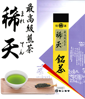 当店自慢の最高級煎茶。 深みのあるコクと甘み、香りが調和した煎茶です。 【商品名】 稀天(まれてん) 【原材料】 緑茶(国産) 【内容量】 100g(チャック付袋) 【賞味期限】 製造日より12ヶ月 【保存方法】 高温多湿を避けて下さい 〈クリックポスト対応商品〉